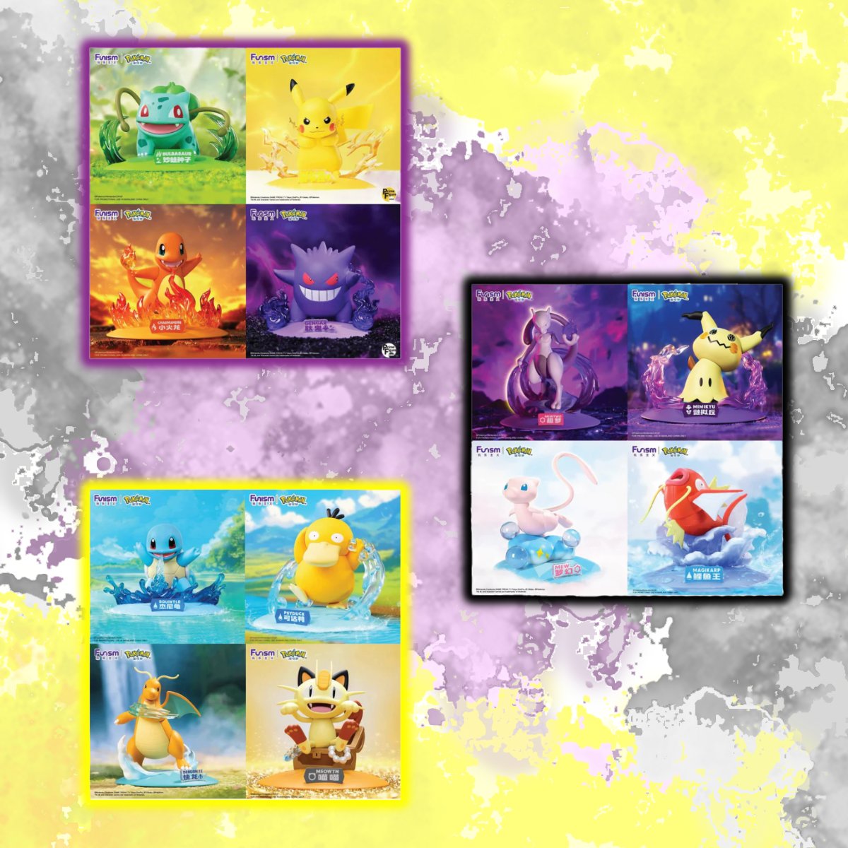 The series includes figures of Bulbasaur, Pikachu, Charmander, Gengar, Mewtwo, Mimikyu, Mew, Squirtle, Psyduck, Dragonite and Meowth.